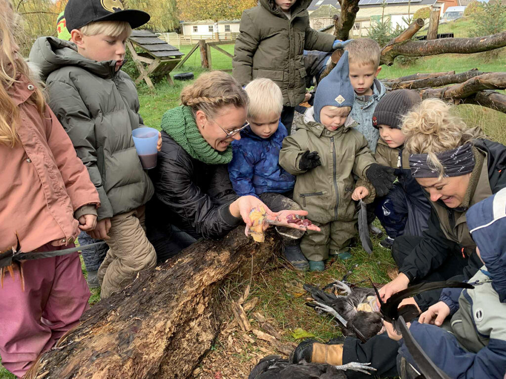 – Det er spændende at se, hvad der gemmer sig under fjerene, fortæller pædagogen, der sammen med børnene udforskede organerne: lever, lunger, hjerte og tarme. – “Kan I se det her?” spørger hun, mens hun viser et stykke tarm frem. “Det er der, lorten kommer ud. – Adr! råber børnene i kor, uden at slippe opmærksomheden fra den døde fugl, og ingen lader til at være påvirket af det faktum at dyret er blevet slået ihjel.