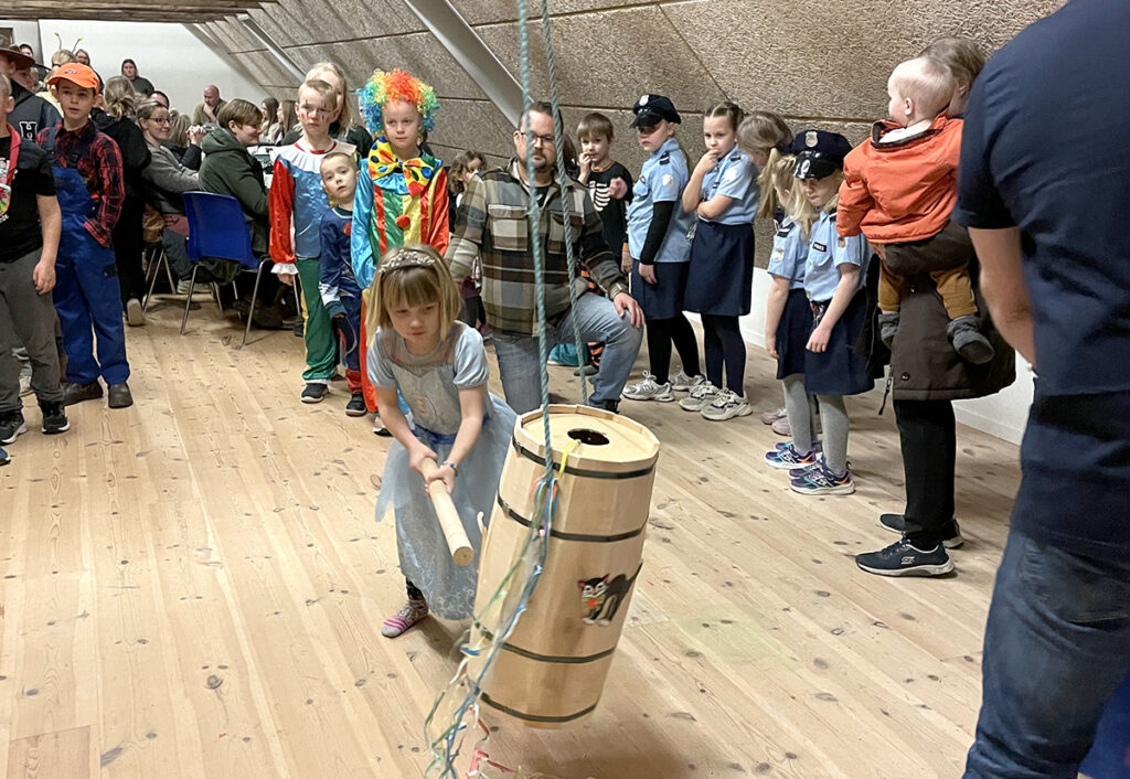Velkomne var hele menigheden også, da festen bagefter fortsatte i den gamle forpagterbolig. Her blev der spist pølsehorn og fastelavnsboller inden den store tøndeslagningskonkurrence kunne gå i gang.