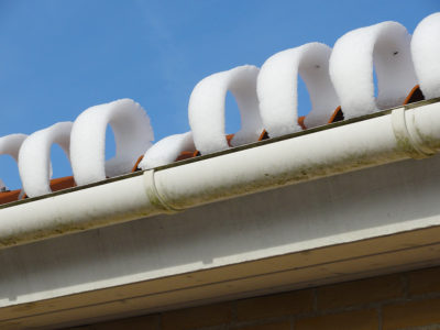 Når sneen på et tag af bølgeeternitplader tør og skrider ned i tagrenden – og det så fryser igen – kan der dannes nogle ... -
