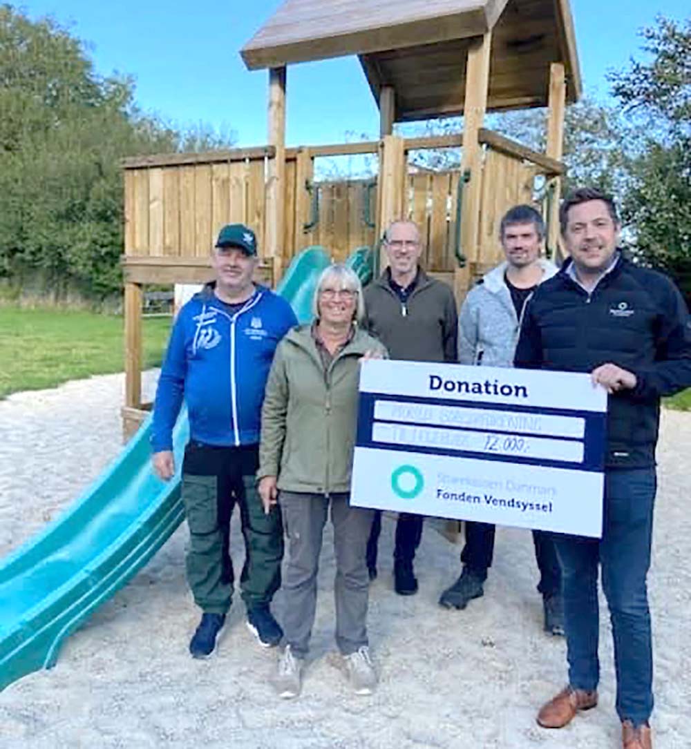 Fællesskabsfølelsen fik yderligere et løft, da bestyrelsen tirsdag kunne tage imod et fornemt besøg fra Sparekassen Danmarks afdeling i Tårs. Her overrakte Anders Sindal, på vegne af Sparekassen Danmark Fonden, en donation på 12.000 kroner. Beløbet er allerede kommet byens børn til gode i form af et nyt legetårn.