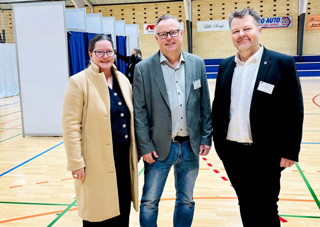 Her ses tre lokale kandidater ved kommunalvalget tirsdag den 18. november i Taars Hallen. Alle tre opnåede valg til byrådet: Fra venstre Lone Olsen (Venstre, 365 personlige stemmer), Tim Jensen (Socialdemokratiet, 256 personlige stemmer) og Søren Homann (Det Konservative Folkeparti, 654 personlige stemmer). Foto: Søren Ejstrup Brunse